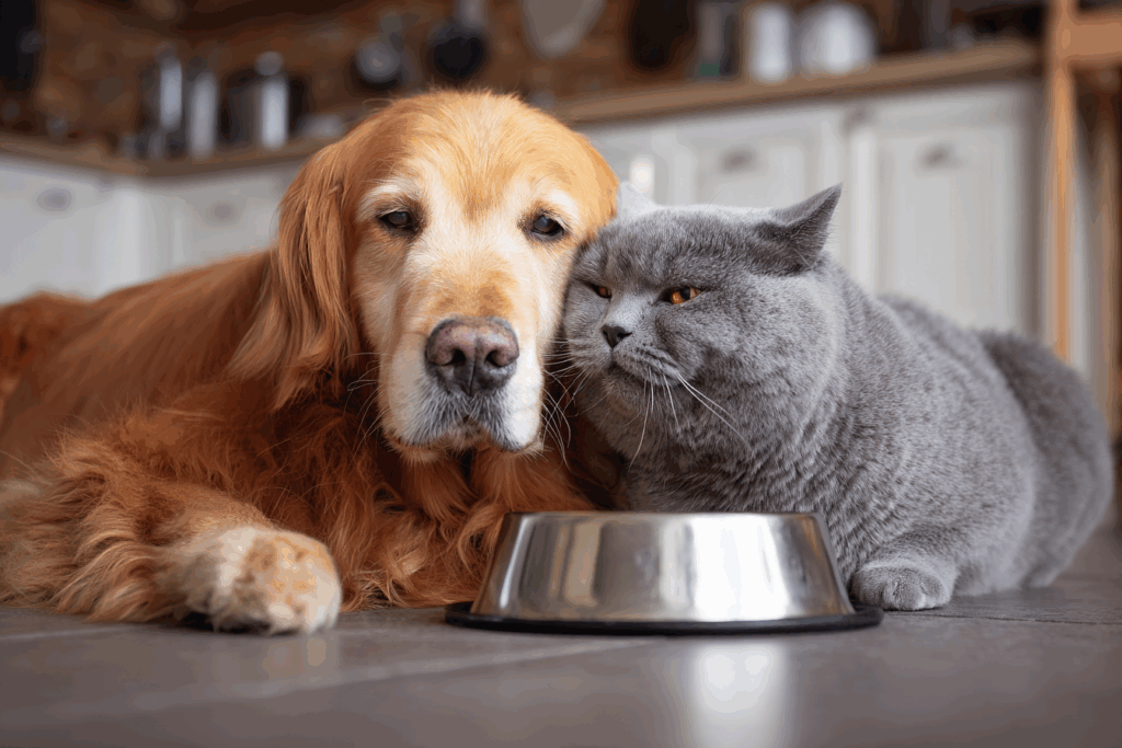 No. Always separate feeding stations. Dogs investigating the cat’s bowl often leads to resource tension, retreat behavior, or conflict.