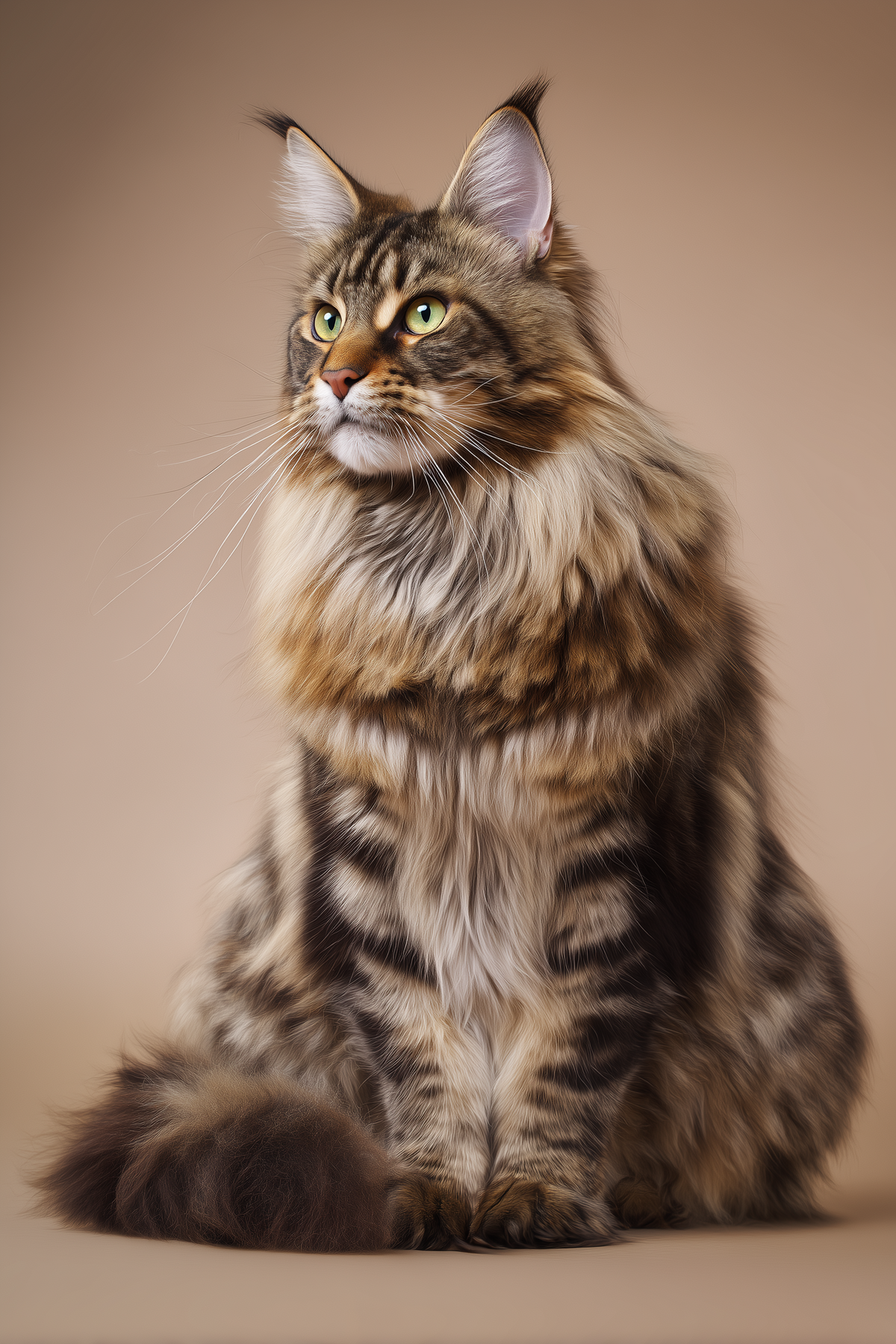 Maine Coons are recognized for their long tufted ears, expressive eyes, and full, bushy tails. They are playful, curious, and enjoy interactive toys and enrichment. Their deep chirps and trills are a unique form of communication and a signature part of the breed’s charm.